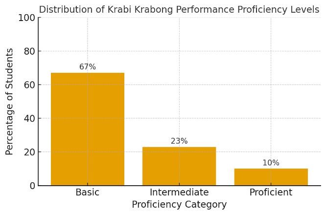 As shown in Figure 8, 67% of students reached basic proficiency in Krabi Krabong movements, including the Tang Sok (elbow position).