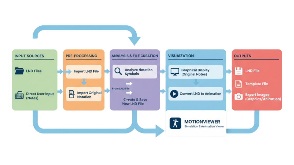 Early technological developments illustrated the potential of combining notation with digital tools. Brown and Smoliar (1976) created the first graphics editor for Labanotation, leading to applications such as LabanWriter at The Ohio State University, which visualized movement using nine vertical body columns (Fig. 1). These tools demonstrated the pedagogical value of symbolic visualization despite technical limitations (Fox, 2000). Progress continued with platforms like LabanDancer and LabanEditor, which translated static notation into animated 3D sequences and extended documentation to non-Western traditions such as Japanese Noh theatre (Kojima et al., 2002; Choensawat et al., 2010).
