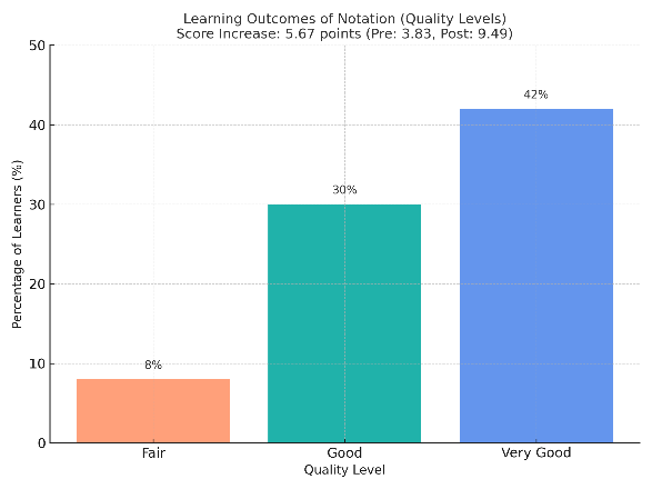 Proficiency distribution also shifted markedly: only 8% remained at a “Fair” level, while 72% achieved “Good” to “Very Good” comprehension. Figure 7 illustrates the distribution of learners’ notation scores before and after training.