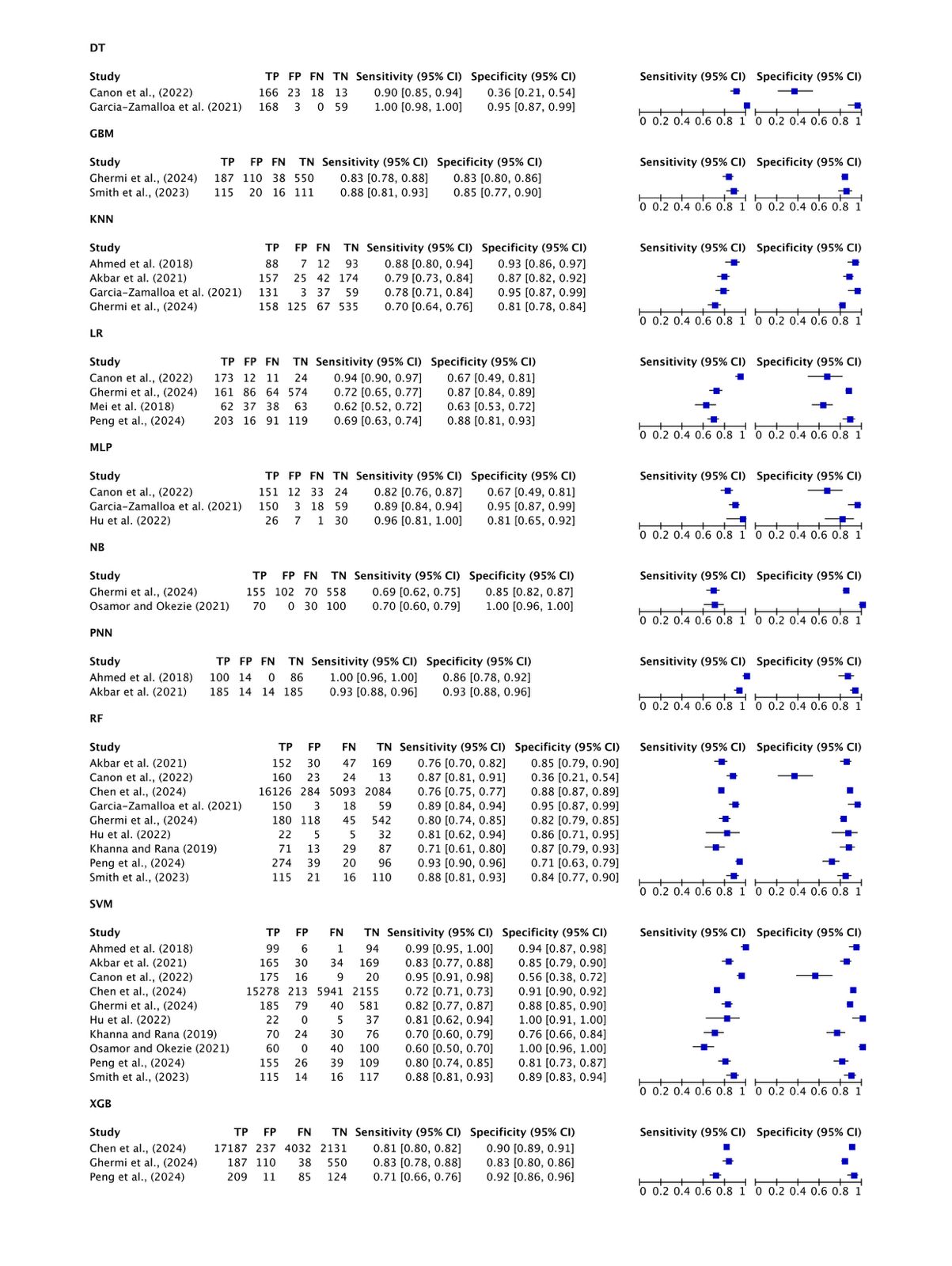 Table 5 shows sAUC for various machine learning algorithms. Among all, PNN achieved the highest AUC (0.9348) with no observed heterogeneity (I2 = 0%), indicating consistent performance. LR, MLP, and GBM also showed high AUCs (above 0.82), suggesting good discriminative ability, though with high heterogeneity (I2 > 89%). In contrast, RF and XGB had lower AUCs (0.7828 and 0.7385, respectively) with substantial heterogeneity. SVM, NB, and DT presented statistically significant results, with high I2 values indicating variability across studies. All models had significant p-values (p < 0.0001), confirming the robustness of their pooled performance. Overall, PNN was the most consistent, while other algorithms showed considerable heterogeneity.