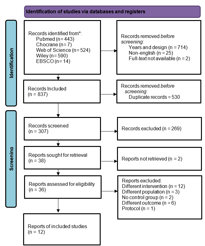 From a total of 1,956 records identified across 6 databases (PubMed: 443, Web of Science: 524, Cochrane: 7, Wiley: 590, EBSCO: 14, and Epistemonikos: 378), 486 records were excluded based on year and type of article filter. Additionally, 119 duplicate records were removed, resulting in 1,351 records for screening. During the screening phase, 983 records were excluded based on their titles, and 330 records were excluded after abstract review. This reduced the list to 38 full-text publications that were evaluated for eligibility and overall analysis. Finally, 12 studies were considered appropriate for inclusion in the meta-analysis. Figure 1 shows the PRISMA flow diagram, which summarizes the screening and selection procedure.