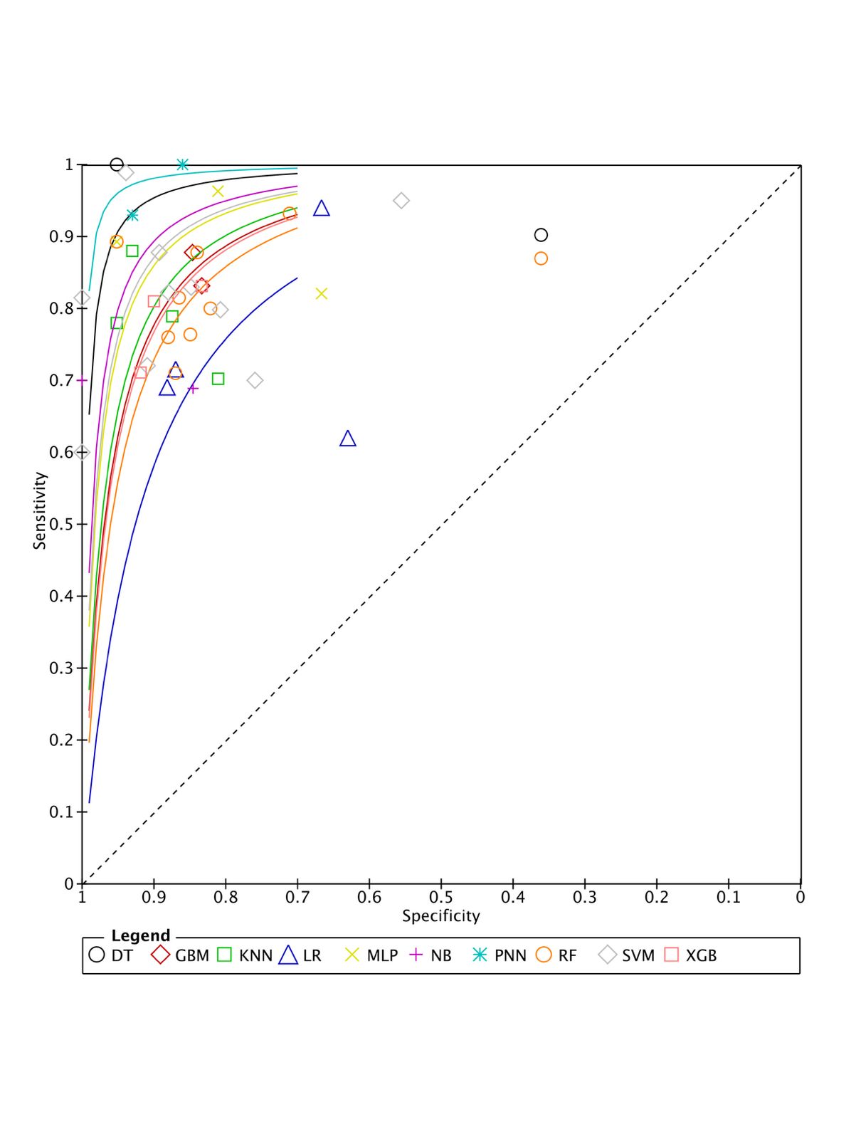In this sROC curves, sensitivity is plotted against 1-specificity to evaluate the overall diagnostic performance. Each curve represents the trade-off between sensitivity and specificity for a specific algorithm, summarizing the diagnostic ability across studies. PNN and DT algorithms indicate superior diagnostic capabilities, characterized by higher sensitivity and specificity.