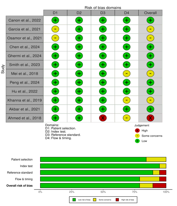 The potential for bias in diagnostic accuracy studies was evaluated using the Quality Assessment of Diagnostic Accuracy Studies-2 (QUADAS-2) instrument [14]. This instrument assesses 4 critical domains: Patient selection, index test, reference standard, and flow and time. The QUADAS-2 evaluation categorizes bias risk into 3 levels: Low (green), moderate (yellow), and high (red). Each research received an overall risk rating, recorded in the “bias” portion of a Microsoft Excel 2021 spreadsheet. The spreadsheet was then uploaded to the ROBVIS platform (https://mcguinlu.shinyapps.io/robvis/ (Accessed on November 14, 2023)) to visualize the assessment results using a traffic light system, enhancing clarity and interpretability.