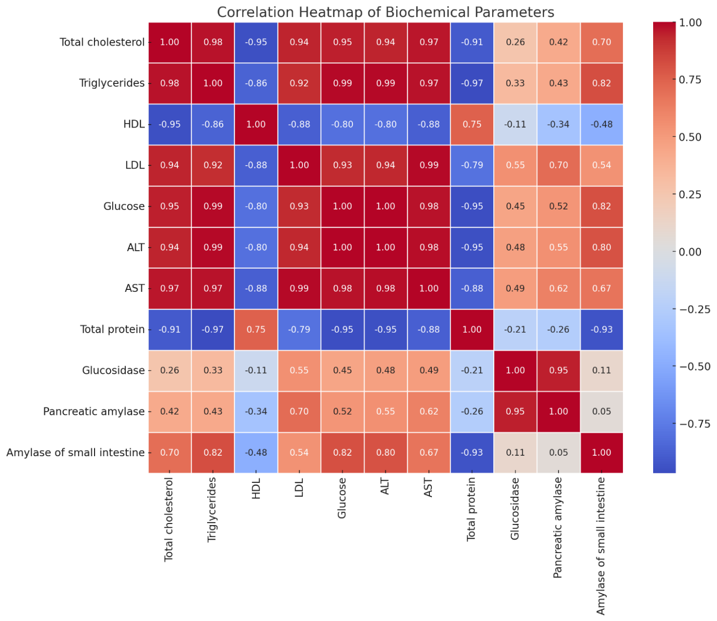 Figure 8 Correlation heatmap of biochemical parameters in rats under hyperlipidemia conditions. The heatmap illustrates Pearson correlation coefficients between major serum biochemical markers measured across experimental groups (Physiological Norm, Control, Metformin 95 mg/kg, and BRP 20 mg/kg). Strong positive correlations are observed among lipid profile components (total cholesterol, triglycerides, LDL), as well as between glucose and liver enzymes (ALT, AST). In contrast, HDL shows a significant inverse correlation with atherogenic and hepatotoxic indices. Color intensity represents the strength and direction of the correlation (Red: Positive; Blue: Negative).