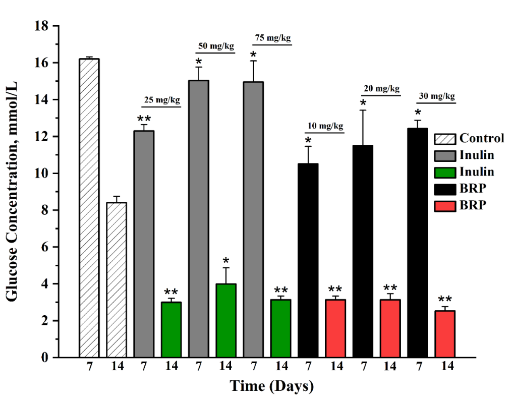 BSP polysaccharide from Brassica rapa turnip seeds reduced glycemia, cholesterol, and LDL cholesterol, but a number of models showed elevated cholesterol, AST, and reduced HDL cholesterol. When eating high-fat foods in mice, TG and cholesterol accumulate in the liver, and the balance of HDL is disrupted LDL, steatosis and inflammation develop. Previously, our research on animal a diabetes model (alloxan rats) have shown: After 7 days, glucose concentration dropped from ~16.2 to 10.5 mmol/L (−35%) when taking BSP at 10 mg/kg, which is more effective than inulin (~24% decrease). After 14 days, blood sugar levels approached the norm, 2.53 - 3.14 mmol/L (control - 8.40 mmol/L) (Figure 6).