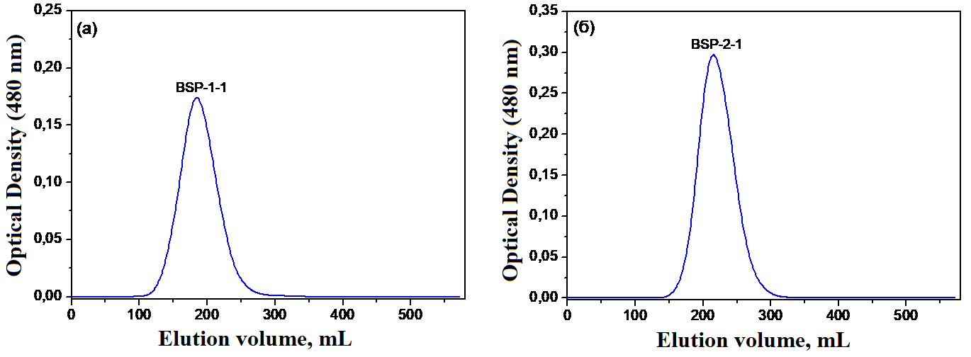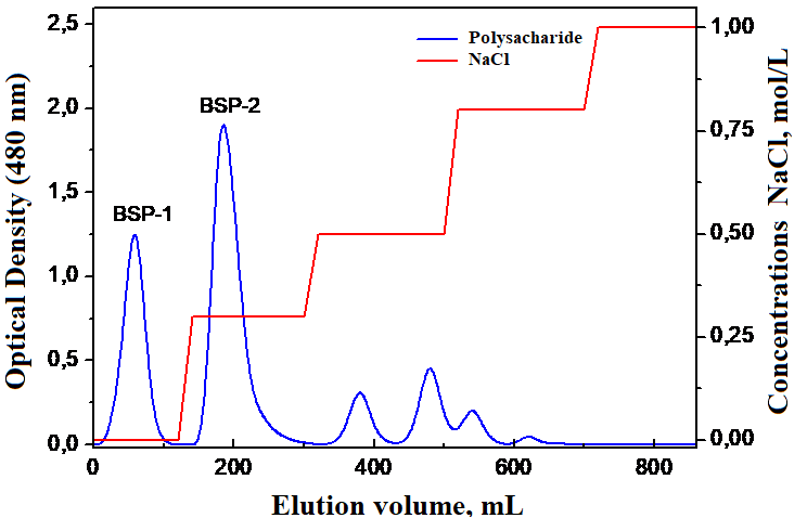 Brassica rapa seeds collected in the Namangan region were used to isolate water-soluble polysaccharides. The seeds were pre-cleaned, ground, and degreased. Water extractions were used to isolate polysaccharides. Polysaccharides were precipitated from aqueous solutions with the addition of ethanol in a ratio of 1:4 (by volume). The yield of polysaccharides was 1.6%. Next, the carbohydrate composition of the isolated polysaccharides was quantified using the phenol-sulfuric acid method. The total amount of carbohydrates was 30.3%, which means that there are impurities in the isolated polysaccharide. Further, the isolated polysaccharides were deproteinized by the Savage method. After deproteination, the amount of protein in the samples was determined using the Lowry method. The results showed that the isolated polysaccharide contains trace amounts of proteins and peptides. A sample of polysaccharide was passed through DEAE-650C. First, they were washed with water and then with a gradient NaCl solution (0 - 1 M). As shown in Figure 1, neutral polysaccharides were separated by washing with distilled water, obtaining 1 polysaccharide fraction (BSP-1), anionic polysaccharides were eluted with 0.1 (BSP-2), 0.3, 0.5 and 0.8 M NaCl solutions. This indicates that this sample consists of a neutral and anionic polysaccharide.