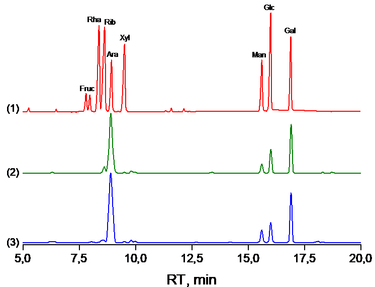 The results show that polysaccharides consist mainly of arabinose and galactose residues. Other monosaccharides were found in their composition in trace amounts.