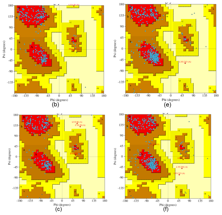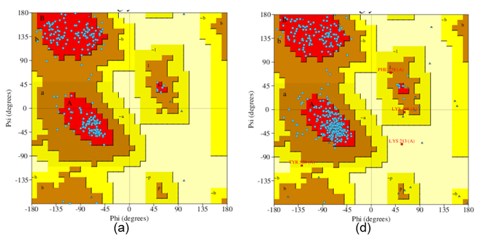 The 3D protein model was validated through a secondary structure analysis utilizing the RAM (Ramachandran) RAM plot, which assesses the dihedral angles ψ (psi) and φ (phi) of amino acid residues. The RAM plot for the protein under study was acquired from the PDBSum online platform [34].