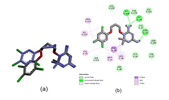 The redocking of the native ligand revealed key interactions with the pfDHFR enzyme. Hydrogen bond interactions were observed with Ile164 (2.20 Å), Ile14 (2.14 Å), and Asp54 (1.83 Å), while hydrophobic interactions involved Pro113, Ile113, Val45, Met55, Phe58, and Leu46. Additionally, a carbon-hydrogen bond was formed with Ser111 and Ile164. These interactions demonstrated the ligand’s strong affinity for the active site of the enzyme. The results highlight the importance of hydrogen bonds and hydrophobic interactions in stabilizing the ligand-enzyme complex, as visualized in Figure 2(b).