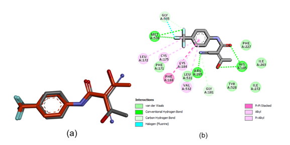 Figure 2 (a) The overlay of WR99210 as the native ligand, displayed in gray before the redocking process and in blue after redocking, (b) The depiction of chemical interactions between WR99210 and the active site of the pfDHFR enzyme.