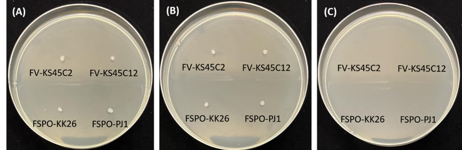 Figure 2 Primary thermotolerance screening of LAB isolates on MRS agar plates. The plates were incubated at (A) 45, (B) 50 and (C) 55 °C for 24 h.