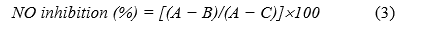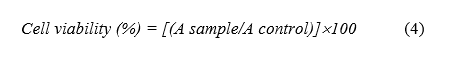 The cytotoxicity of the anti-inflammatory treatment conditions was evaluated using the 3-(4,5-dimethylthiazol-2-yl)-2,5-diphenyltetrazolium bromide (MTT) assay [34]. The suspensions of the aforementioned treated RAW 264.7 cells were added into 96-well plates and incubated for 24 h at 37 C under 5% CO2. After incubation, the cell culture medium was removed and maintained with 0.5 mg/mL MTT solution for 3 - 4 h. The formazan crystals that formed were dissolved in dimethyl sulfoxide. Cell viability was determined by measuring the absorbance at 570 nm and calculated according to Eq. (4), where A sample denotes the absorbance of the sample (sample + LPS) and A control denotes the absorbance of the untreated sample (cell culture medium only):