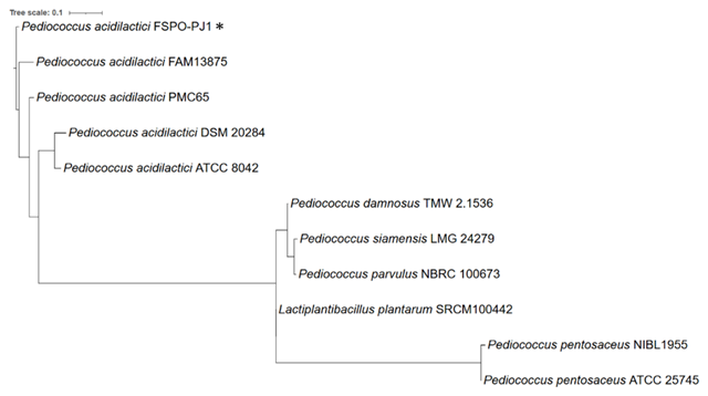 Raw sequencing reads were assessed for quality using FastQC v0.12.0 [18] and subsequently trimmed using Fastp v0.24.0 [19] and Trimmomatic v0.40 [20]. Genome assembly was performed with SPAdes v4.0.0 using the isolate flag and a memory allocation of 400 MB (–m 400) [21]. LAB strain FSPO-PJ1 was identified at the species level and local sequence alignment was performed using the standalone BLAST tool (blastn) [22]. For phylogenetic analysis, open reading frames, RNA genes and coding DNA sequences were identified and genome annotation was performed using Prokka v1.14.6 [23]. The resulting general feature format files were subsequently used. A phylogenetic tree was constructed based on the presence and absence of core and accessory (pan) genes using Roary v3.13.0 [24] and visualized using the interactive Tree of Life (iTOL) v6 [25]. The reference genome sequences of Pediococcus and the outgroup (Lactiplantibacillus plantarum SRCM100442) were retrieved from GenBank. Accession numbers for reference genomes are as follows: FAM13875: PRJNA576774; TMW 2.1536: PRJNA290141, NBRC 100673: PRJDB6092; LMG 24279: PRJNA1208221; ATCC 25745: PRJNA398; NIBL1955: PRJNA1086194; SRCM100442: PRJNA438180; ATCC 8042: PRJNA503305; DSM 20284: PRJNA50527; and PMC65: PRJNA632644.
