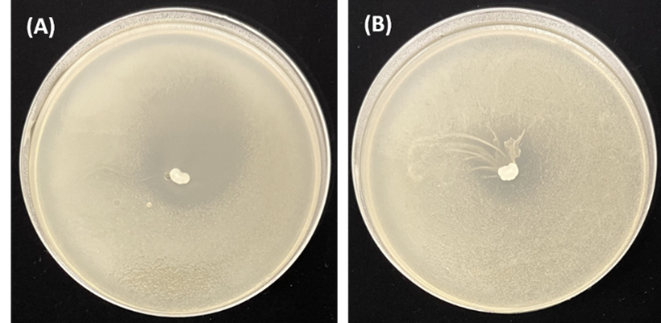 The antagonistic activity of the selected LAB strain FSPO-PJ1 against B. cereus TISTR 687 and S. aureus DMST 8840 - foodborne pathogens that may contaminate amazake products - was analyzed using an agar overlay method [17]. FSPO-PJ1 was inoculated with a loop-full (approximately 105 CFU/spot) on MRS agar and incubated at 37 C for 48 h. MRS agar plates with FSPO-PJ1 colonies were overlaid with 10 mL of soft nutrient agar (0.8% agar) premixed with each foodborne pathogen (final number: 106 CFU/mL) and incubated at 37 C for 24 h. The zone diameter of inhibition (ZDI) was interpreted as follows: ZDI > 20, 10 - 20 and < 10 mm were defined as strong, intermediate and weak inhibition, respectively. The width of the clear zone (R) was calculated using Eq. (1) where d Inhib and d Spot are the diameter of the clear zone and diameter of the LAB colony, respectively.