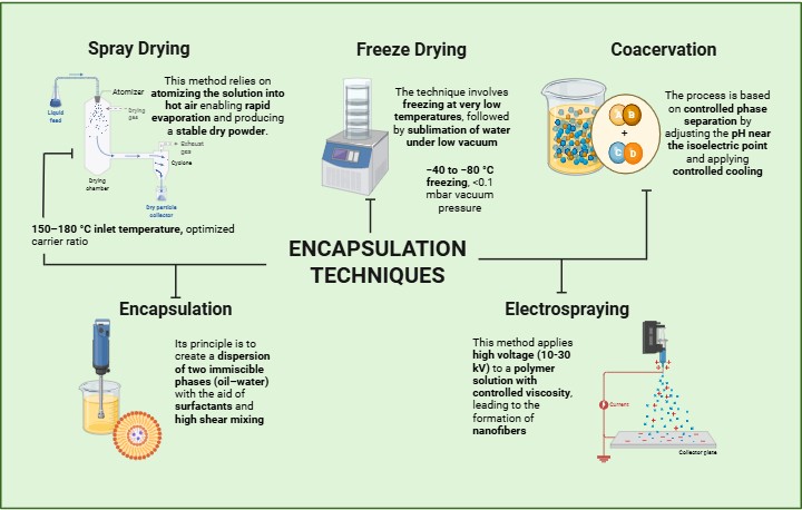 The final collection was organized into 4 themes: (1) Mechanisms and bioactivity of plant extracts against spoilage and oxidation; (2) encapsulation technologies and their impact on stability and release; (3) applications of encapsulated extracts in carbohydrate-based foods; and (4) regulatory, safety, and consumer acceptance. For comparative synthesis, we extracted wall material composition and concentrations, extract loads, process parameters (e.g., spray/freeze drying conditions, emulsion ratios, electrospraying voltage in kV), and encapsulation outcomes such as efficiency, stability, and bioactivity. Where exact values were not reported, approximations were noted based on comparable protocols from the same technique family.
