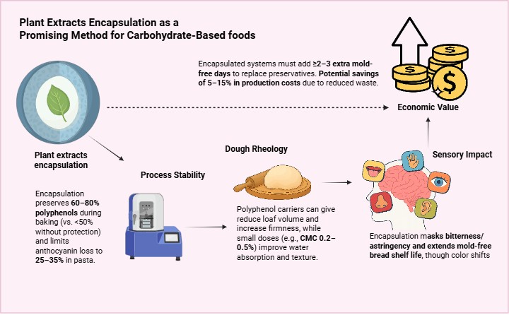 Carbohydrate-based foods, including breads, noodles, cereals, and snacks, are highly susceptible to microbial spoilage and oxidative deterioration, leading to significant reliance on synthetic preservatives such as propionates, sorbates, and benzoates. Concerns about their potential health risks, environmental persistence, and negative consumer perception have intensified the search for natural, clean-label alternatives. This review aims to evaluate the potential of encapsulated plant extracts as replacements for synthetic preservatives, examining their antimicrobial mechanisms, encapsulation strategies, food applications, and industrial and regulatory considerations.