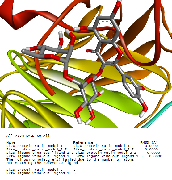 Molecular docking validation was conducted by re-docking the best, i.e. rutin toward α-glucosidase receptor (id:5kzw) using AutoDock 4.2 software. The docking validation was considered successful if the root-mean-square deviation (RMSD) value was less than 2 Å, as shown Figure 4. The molecular docking process was carried out using AutoDock Tools and AutoDock Vina.