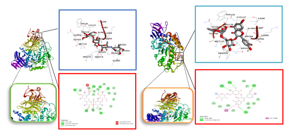 The differences in binding affinity can be seen in Figures 2 showing the acarbose-α-amylase interaction, including only 5 conventional hydrogen bonds and van der Walls interaction, but rutin-α-amylase, including 2 hydrogen bonds conventional, carbon-hydrogen bond, unfavorable donors, alkyl, Pi-alkyl, unfordable acceptor-acceptor, and van der Walls. Likewise, molecular docking analysis shows that the binding affinity of acarbose-α-amylase complexes (BA = –7.806 kcal/ mol) is lower than that of rutin-α-glucosidase complexes (–8.756 kcal/ mol).