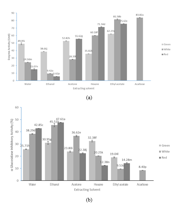Figure 7 α-Glucosidase activity and inhibition by Moringa oleifera leaf powder (MOLP) extracts from red, green, and white leaf stalks. Data are presented as mean ± SD (n = 6). Different letters (a-p) indicate significant differences at p < 0.05.