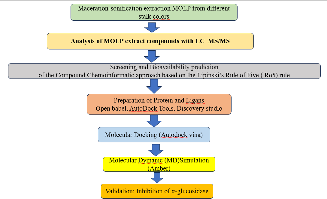 The AutoDock Tools 1.5.7 software was used to prepare the active compounds of 57 MOLP compound compounds from LC-MS. Ligand files for molecular docking are stored in the *pdbqt forma. The chromatogram and mass spectra results were analyzed using Masslynx version 4.1 software on BPI (base peak intensity) because it shows more detailed resolution and intense peaks. The compounds in the 3 MOLPs will first be predicted for their bioavailability using a chemoinformatic approach based on Lipinski’s rule of 5 (Ro5) rule using SwissADME.