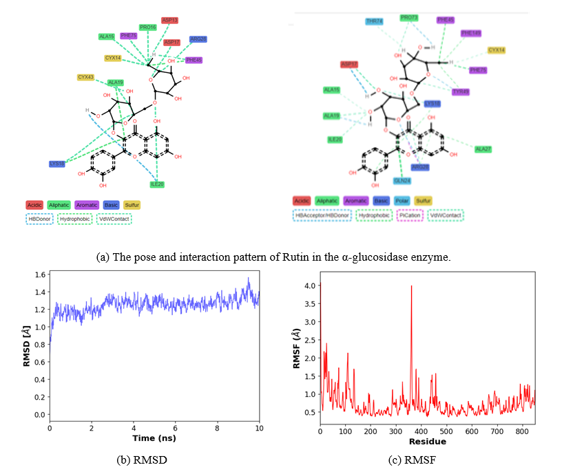 Molecular dynamics (MD) simulations were carried out to study the inhibitor binding interactions of compound ligands with the best docking score models (Acarbose CID41774) with α-glucosidase (id:5kwz) receptors. The interaction uses OpenMM in Google Colab. Preparation of ligands Rutin’s (CID5280805) 3-dimensional structures were retrieved from the PubChem Open Chemistry Database. Next, 3 different compound structures in smile format are transformed into *force field (FF) parameters for organic compounds or ligands utilizing pdb files with LigParGen, web-based applications [21,23]. When setting the environment for MD calculation, we need to install all the necessary libraries and packages for our simulation. The main packages we will be installing are: Anaconda OpenMM PyTraj ProLIF Numpy Matplotlib and AmberTools. Ligand and protein *.pdf files are uploaded and diversified on g-drive and g-colab.