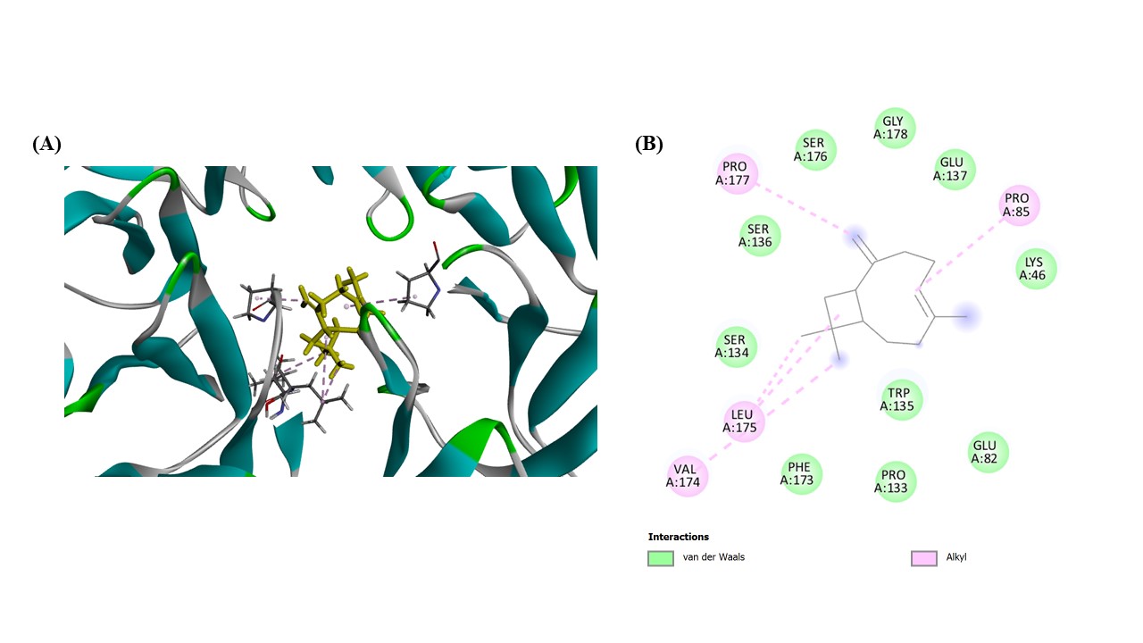 To confirm the interactions between BCP and the targeted proteins, in silico molecular docking was performed. Molecular docking can be valuable for elucidating the molecular mechanism of a bound ligand at the active site of a target protein. According to a molecular docking analysis against GRP78 and EIF2A, BCP exhibited a bounded conformation and interactions in the active binding site of both proteins. The evaluation of molecular docking of BCP at the active binding site of the GRP78 protein showed that BCP potentially generated a van der Waals interaction network with SER365, GLY227, THR38, LEU225, THR229, GLY226, GLY364, SER40, GLY36, THR37, ASP231, ASP224, LEU35, LYS96, VAL394, ASP34, GLY363, PRO390, ASP391, GLU392, CYS41 residue of the target protein. Additionally, VAL362, TYR39 and ILE61 were involved in alkyl and Pi-alkyl interactions of BCP with GRP78 (Figure 5). Furthermore, the interaction between BCP and EIF2A was also determined. BCP generated a van der Waals interaction network with SER176, GLY178, GLU137, SER136, LYS46, SER134, TRP135, PHE173, PRO133, GLU82 residues of the EIF2A protein. Moreover, PRO177, PRO85, LEU175 and VAL174 residues were involved in alkyl and Pi-alkyl interactions between BCP and EIF2A protein (Figure 6).