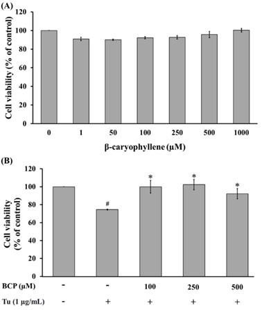 Figure 1 Effects of β-caryophyllene (BCP) on (A) cell viability and (B) the cytoprotective effect of BCP against tunicamycin (Tu)-induced ER stress in RASMCs cells. All values are presented as mean ± SEM (n = 4). Statistical significance was determined using Tukey post hoc analysis, with significance accepted when p-value < 0.05 (# compared to the control group, * compared to the Tu group).