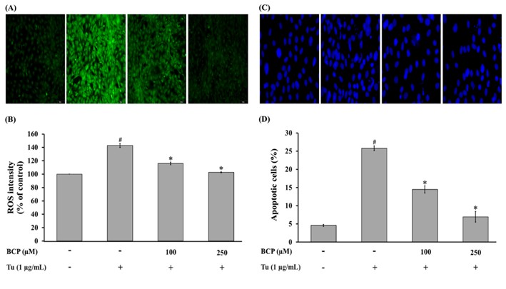 Figure 2 Effect of β-caryophyllene (BCP) on the reactive oxygen species (ROS) and apoptosis against tunicamycin (Tu) induced-ER stress in RASMCs cells. (A) The ROS levels were detected by fluorescence microscopy. (B) The ROS intensity was measured by ImageJ program. (C) Morphology of apoptotic nuclei stained with DAPI. (D) The percentages of apoptotic cells were calculated. All values are presented as mean ± SEM (n = 4). Statistical significance was determined using Tukey post hoc analysis, with significance accepted when p-value < 0.05 (# compared to the control group, * compared to the Tu group).