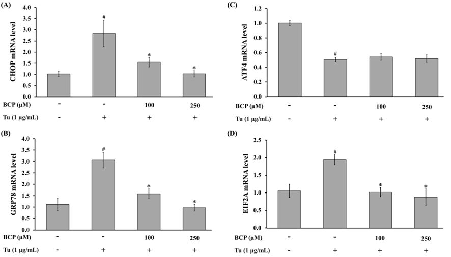 Figure 3 Effects of β-caryophyllene (BCP) on the mRNA expression of CHOP, GRP78, ATF4 and EIF2A on tunicamycin (Tu)-induced ER stress in RASMCs cells. The cells were pre-treated with BCP for 24 h followed by the ER stress inducer Tu for 24 h. (A) CHOP, (B) GRP78, (C) ATF4 and (D) EIF2A. All values are presented as mean ± SEM (n = 4). Statistical significance was determined using Tukey post hoc analysis, with significance accepted when p-value < 0.05 (# compared to the control group, * compared to the Tu group).