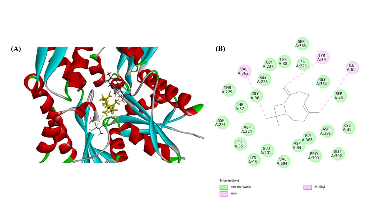 Simulations of the molecular docking process of BCP and the target protein were conducted using the Genetic Optimisation for Ligand Docking (GOLD) program version 5.3.0 software and Discovery Studio 2021 software [15]. The protein structure was prepared by initially removing water molecules, followed by adding hydrogen atoms to the protein models using the GOLD setup process. The docking site is situated at the active site of the target protein structures, positioned on the ligand. A Genetic Algorithm (GA) search process was then carried out at the most accurate level (slow mode) and the molecular docking was evaluated using the Chem Score fitness function [16]. PLP fitness scores were utilized to assess the docking of BCP at the binding site of the target proteins. Furthermore, Discovery Studio 2021 software was employed to identify the hydrophilic, hydrophobic, electrostatic and van der Waals forces resulting from the interaction between target proteins and BCP [17]. Physicochemical and pharmacokinetic profiles of BCP were assessed to evaluate the drug-like attributes of the chemical compound using the SwissADME web tool [18].