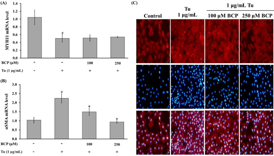 Figure 4 Effects of β-caryophyllene (BCP) on the expression of MYH11 and αSMA on tunicamycin (Tu)-induced ER stress in RASMCs cells. The cells were pre-treated with BCP for 2 h followed by Tu and BCP for 24 h. (A) MYH11 gene, (B) αSMA gene and (C) the αSMA proteins were detected by immunofluorescence. All values are presented as mean ± SEM (n = 4). Statistical significance was determined using Tukey post hoc analysis, with significance accepted when p-value < 0.05 (# compared to the control group, * compared to the Tu group).
