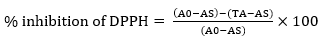 where A0 represents the absorbance of the DPPH control solution, AS corresponds to the absorbance of methanol (blank), and TA denotes the absorbance of the tested sample. Antioxidant capacity was expressed as IC 50 , defined as the extract concentration required to inhibit 50% DPPH radicals. IC 50 values were determined from the linear regression of extract concentration versus inhibition percentage (IA%). Lower IC 50 indicates greater antioxidant activity.
