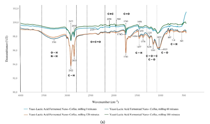 Figure 2 FTIR spectra of both non-fermented nano-coffee (a) and yeast-lactic acid fermented nano-coffee (b) across varying milling durations.