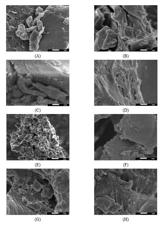 Figures 1(A) - 1(D) shows non-fermented coffee samples ball milled for 0, 60, 120, and 180 min, respectively. The micrographs at 0 min (prior to milling) revealed large, compact, and angular particles with well-defined edges and smooth surfaces. These features are typical of an intact and mechanically resilient plant cell wall composed primarily of cellulose, hemicellulose, lignin, and associated proteins. As milling time increased, progressive breakdown of these structures was observed. At 60 min, surface erosion and edge blunting became apparent, signaling the initial disruption of structural integrity. At 120 min, the particles exhibited extensive fragmentation, with layered and irregular morphology. By 180 min, particle structures had visibly collapsed, showing smoother surfaces, reduced porosity, and significant compaction, consistent with the cumulative effects of mechanical stress and energy input. These findings suggest that the non-fermented matrix required prolonged mechanical input for effective comminution due to its rigid, undegraded structure. Conversely, Figures 1(E) - 1(H) depicts yeast-lactic acid bacteria (LAB) fermented coffee samples milled for 0, 60, 120, and 180 min, respectively. Fermented samples showed notably different microstructural features even prior to milling. At 0 min, the surfaces were already porous, rough, and loosely packed. This was attributed to microbial enzymatic activity during fermentation, particularly from yeasts and LAB, which produce cellulases, pectinases, and proteases that degrade cell wall components such as cellulose and pectin. These enzymatic actions weaken the structural matrix, leading to surface cracks, increased porosity, and irregular pore distributions. By 60 min of milling, fermented samples exhibited significantly greater fragmentation compared to non-fermented ones. The micrographs at 120 and 180 min revealed highly amorphous, collapsed structures with smoother yet more disrupted surfaces, suggesting deformation and reduced mechanical resistance. The particles appeared more disordered, with micro-fractures and signs of surface melting or fusion, likely due to enhanced susceptibility to the shearing and compressive forces of the milling media.