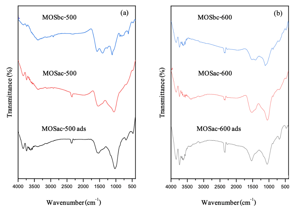 This morphological enhancement is corroborated by BET surface area data (Table 2) , which indicate that both the BET surface area and porosity of MOSbc-600 are higher than those of MOSbc-500. The increase in porosity is accompanied by a slight reduction in yield, with MOSbc-600 exhibiting a lower biochar yield (32.64%) compared to MOSbc-500 (34.99%). Following the activation process ( Figures 2(e) - 2(h) ), the biochar surface displays increased roughness, fragmented sheet-like structures, more complex morphology, enhanced porosity, and a more irregular, folded appearance. A higher pyrolysis temperature (600 °C) results in a greater number and interconnectivity of pores, as shown in the SEM images ( Figures 2(g) - 2(h) ) and supported by data in Table 2 . This enhancement in porosity at elevated temperature is also associated with a reduction in biochar yield, decreasing from 74.47% for MOSac-500 to 64.56% for MOSac-600, as presented in Table 1 . These morphological transformations, particularly the increase in porosity and the development of complex, folded structures, are essential for increasing the number of accessible adsorption sites and facilitating intraparticle diffusion of adsorbate molecules, thereby enhancing adsorption efficiency and kinetics. During KOH activation process, thermal energy is absorbed by potassium (K) atoms impregnated within the biochar matrix, energizing them and facilitating their migration into internal structure of the carbon matrix [8]. This intercalation process facilitates the expansion and widening of existing pores. Upon continued heating, the intercalated K atoms are removed, resulting in the formation of a highly porous carbon structure. According to Astuti et al. [8], the development of porosity during KOH activation can be attributed to the reaction between carbon and KOH (C f -KOH), as shown in Eqs. (6) - (14).