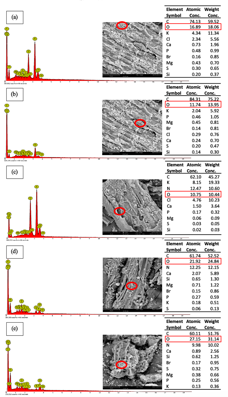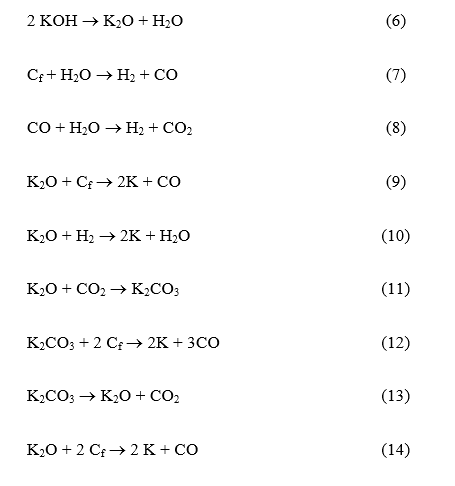 Based on Eqs. (12) - (14), it can be concluded that K atoms are produced as a final product in the series of reactions that occur during the KOH activation process. Activation typically takes place at temperatures around 800 °C, while the boiling point of potassium is 759 °C [8]. Consequently, a significant portion of the potassium volatilizes during the subsequent heating phase following intercalation, escaping through the furnace ventilation and exhaust systems. This volatilization is supported by the low potassium content detected in the SEM-EDX analysis ( Figures 3(d) and 3(e) ). Therefore, it can be inferred that the diffusion of potassium compounds into the internal structure of the biochar matrix contributes not only to the widening of existing pores, as previously described, but also to the formation of new pores through reactions between the carbon fraction (C f ) and potassium compounds.