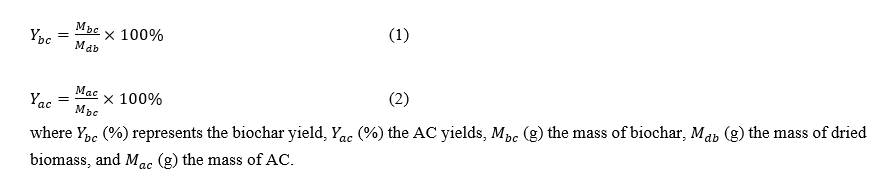 Pyrolysis of MOS powder was carried out in a ceramic muffle furnace (B-ONE BFNC-2-1200) under limited air conditions [9] at 2 target temperatures: 500 °C (denoted as MOSbc-500) and 600 °C (denoted as MOSbc-600). A temperature of 500 °C was achieved within 43 min and 600 °C within 51 min, both corresponding to a heating rate of 0.2 °C/s. The samples were then held at their respective temperatures for 2 h to facilitate biochar formation. Chemical activation was subsequently performed using potassium hydroxide (KOH) at a mass ratio of 3:1 (KOH:Biochar). Specifically, 30 g of KOH was dissolved in 15 mL of distilled water and thoroughly mixed with 10 g of biochar. The mixture was stirred for 2 h and then dried in an electric oven (UN55, Memmert, Germany) at 105 °C until a constant weight was achieved. The dried impregnated biochar was then subjected to thermal activation in the same furnace (B-ONE BFNC-2-1200) under limited air at a target temperature of 800 °C. This temperature was attained within 65 min at a heating rate of 0.2 °C/s, and the samples were held at 800 °C for 1 h. Following activation, the resulting AC was washed with 0.1 M hydrochloric acid (HCl) and repeatedly rinsed with distilled water until a neutral pH was achieved. The final product was then dried again at 105 °C until a constant weight was obtained. The AC derived from MOSbc-500 and MOSbc-600 were denoted as MOSac-500 and MOSac-600, respectively. Biochar yield was calculated as the ratio of the mass of biochar obtained after pyrolysis to the mass of the dried raw biomass, as expressed in Eq. (1). Similarly, the AC yield was determined as the ratio of the mass of AC obtained after KOH activation to the mass of biochar prior to activation, as expressed in Eq. (2) [8,9]. The results are summarized in Table 1 .