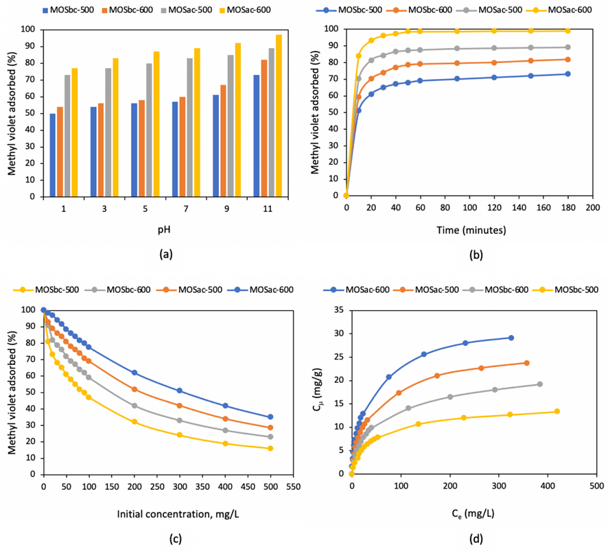 On the other hand, the exploration of plant biodiversity that demonstrates both resilience to extreme environmental conditions and alignment with the United Nations Sustainable Development Goals (SDGs) has become a key research priority. Moringa oleifera , a tropical plant native to India, is considered one of the most suitable candidates in this regard due to its remarkable adaptability; it thrives in both humid tropical climates and arid, nutrient-deficient soils [17]. Various parts of the plant, including leaves, stem, and seeds, are rich in antioxidants such as flavonoids, polyphenols, niazirins, and isothiocyanates [18], which contribute to its wide range of health-promoting properties. However, the extraction of these bioactive compounds generates solid residues that are often underutilized, such as moringa oleifera stem (MOS). Given that the agricultural and industrial sectors are among the largest global contributors to biowaste, the reduction and valorization of agro-industrial residues such as MOS are critical for advancing circular economy practices. The stem contains approximately 30.61% cellulose, 27.37% hemicellulose, and 20.78% lignin, making it a promising precursor to produce AC. During biomass pyrolysis, cellulose, hemicellulose, and lignin decompose at different rates and over distinct temperature ranges. Consequently, the yield and characteristics of the resulting AC are influenced not only by the intrinsic properties and composition of the precursor material but also by the specific pyrolysis conditions and activation methods employed. Despite its potential, the combined effects of lignocellulosic composition and pyrolysis temperature on the surface chemistry, microstructure, and adsorption performance of AC derived from MOS remain underexplored. This gap highlights the need for systematic studies aimed at optimizing both AC yield and quality. Such investigations are essential for fine-tuning pyrolysis parameters to achieve the desired physicochemical characteristics of the final product. In this context, MOS was selected as a precursor primarily due to its high content of 3 major biopolymers (e.g., lignin, cellulose, and hemicellulose) enabling the observation of significant changes in physicochemical properties under varying pyrolysis conditions. Additionally, the potential of MOS-derived AC for MV adsorption was also evaluated. Key operational parameters, including pH, contact time, and initial dye concentration, were investigated. Furthermore, equilibrium studies were also conducted to determine essential parameters for adsorption process design [8,9].