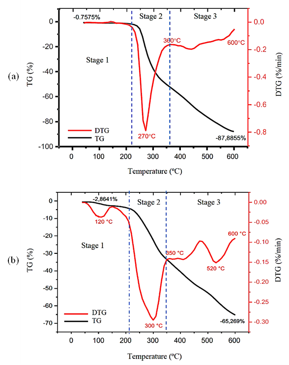 Figure 1(a) illustrates the thermogravimetric (TG) and derivative thermogravimetric (DTG) curves for MOS, showing the relationship between mass loss and the rate of mass change. The TG curve demonstrates a non-linear and progressive reduction in mass, occurring in 3 distinct stages. These stages correspond to the thermal degradation of the major biomass components: Hemicellulose, cellulose, and lignin, each exhibiting different thermal stabilities [20,21]. In the first stage, occurring below 220 °C, a mass loss of approximately 0.76% is observed, primarily attributed to the evaporation of moisture and low molecular weight volatile compounds. This initial loss indicates the presence of volatile components in the raw material that degrade under mild thermal conditions. The second stage, spanning 220 - 360 °C, is characterized by thermal decomposition of hemicellulose and cellulose, leading to the evolution of volatile compounds and non-condensable gases such as CO 2 , CO, and H 2 . This stage results in a significant mass loss of 54.3%. The third stage, occurring above 360 °C, involves the gradual, passive pyrolytic degradation of the remaining biomass, particularly lignin, resulting in a slower rate of mass loss as temperature increases. This stage is associated with biochar formation. Unlike the preceding stages, it does not exhibit a distinct degradation peak. Instead, the degradation rate progressively decreases and approaches an asymptote, indicating the slow and continuous breakdown of lignin. This stage contributes an additional mass loss of 32.8%. At the maximum experimental temperature of 600 °C, the total mass loss reached 87.9%, leaving a solid residue of 12.1%. This residual mass is lower than that observed at 500 °C, where 26.5% of the original mass remained. The residual fraction primarily consists of lignin-derived products, with minor contributions from the incomplete decomposition of hemicellulose and cellulose [19,22]. As cellulose is nearly completely pyrolyzed at temperatures above 400 °C, its contribution to the residual solid mass is minimal. Accordingly, higher lignin content correlates with increased char yield. For comparison, Pithecellobium jiringa peel, which contains a higher lignin content (42.47%) than MOS (20.78%), produced significantly higher solid residues 46.6% and 34.7% at pyrolysis temperatures of 500 and 600 °C, respectively ( Figure 1(b) ).
