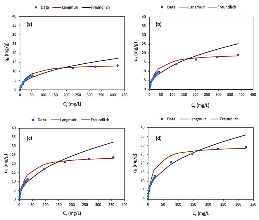 Figure 6 Isotherm adsorption for (a) MOSbc-500 - methyl violet system, (b) MOSbc-600 - methyl violet system, (c) MOSac-500 - methyl violet system, and (d) MOSac-600 - methyl violet system.