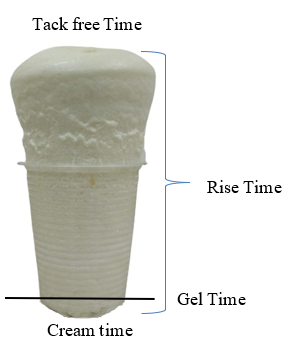 The polyurethane sample undergoes physical testing where measured its foam reaction time. The foam reaction time for the samples was determined by using ASTM D7487. The characteristics of the time that were shows on the Figure 2 , were observed using stopwatch during the foaming process in the plastic cup until it completely rises and loses its tackiness. Table 3 shows the definition of each type characterization time that were measured. The synthesized were repeated 3 times to ensure consistency.