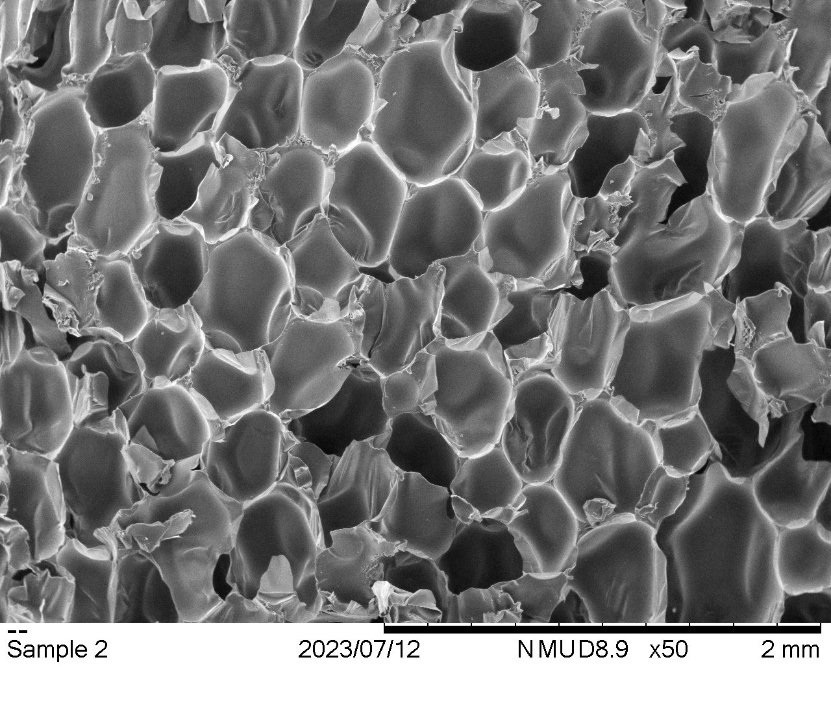 For morphology analysis, the sample were cut with dimension of a square of 50 mm on each side. The sample then will be coated in gold using the sputter coatings. Then, it was analyzed by using Scanning Electron Microscopy (SEM) with magnification of 80X with different angles of the sample. Then the image analysis was performed using ImageJ software. The SEM images were calibrated using the provided scale bar. Cell size (diameter) was determined by measuring the Ferret diameter which the longest distance between any 2 points along the cell boundary of at least 50 - 100 individual cells randomly selected from each image. The cell size (area) and number of foam cell were calculated.