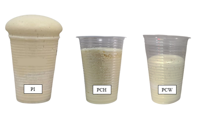 Figure 3 Physical appearance of the polyurethane industry (PI), castor oil-HCFC (PCH) and castor oil-water (PCW).