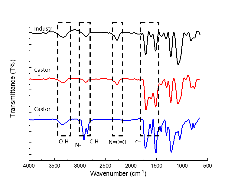 The industrial polyurethane, materials used in the production are Polyol type NCL LG108-GI and NCL LG108-GI isocyanate. Both materials are supplied by Al Fazance Resources. As for the green polyurethane the chemicals used were castor oil based polyol contain of hydroxyl value if 161.89 g/mol. Isocyanate (4,4-methylenediphenyl diisocyanate) with NCO content: 31%, molecular weight: 360, Pentamethyldipropylenatriamine copolymer (PMDETA) function as blowing catalyst and dimethylcetylhexamine (DMCHA) function as gelling catalyst where both catalysts were supplied by Teguh Sainstek Sdn Bhd. Water (H2O) and 1,1-Dichloro-1-fluoroethane (HCFC 141b) will be act as blowing agent.