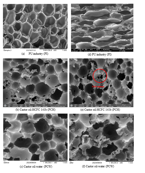 For PI, non-blowing agent PU, polyol to isocyanate ratio is 1:1 signifies a balance between the use of polyol and isocyanate, with no additives required. The ratios were optimized to attain specific foam properties, including a balance of mechanical strength and lightweight characteristics with closed cells. The PCH ratio of polyol: isocyanate and HCFC-141b ratio was 1:1:0.25 indicates, attributed to the content of fatty acid chains in castor oil, which can affect the cell structure and foam stability. A reduced amount of HCFC 141b is necessary to achieve the desired closed cell structure and adequate mechanical strength. The PCW ratio of polyol: isocyanate and water was 1:1:0.015. Water reacts with isocyanate, potentially consuming them in the process. An increased water ratio may diminish the effectiveness of isocyanates in urethane synthesis, thereby compromising the stability of the polymer network.