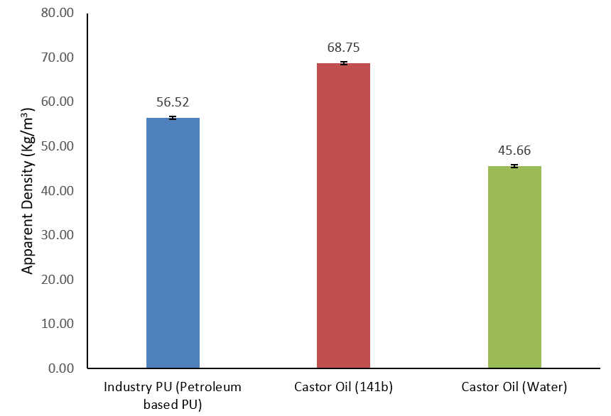 The apparent density was measured by including the outer skin of the polyurethane foam. After the sample were let 24 h for curing process takes places the samples were weighed and calculate its apparent density. Then, the steps were repeated for 3 times according to method ASTM D1622-08.