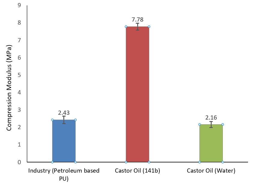 The PCW demonstrates a compression modulus of 2.16 MPa which 11.1% less than PI. This value signifies that the foam exhibits relative flexibility and reduced rigidity, attributable to the cellular structure developed when water serves as the blowing agent [28]. The interaction of castor oil and water results in a structure that balances stiffness and flexibility. This foam type is preferable for applications requiring a certain level of compressibility and cushioning [34].