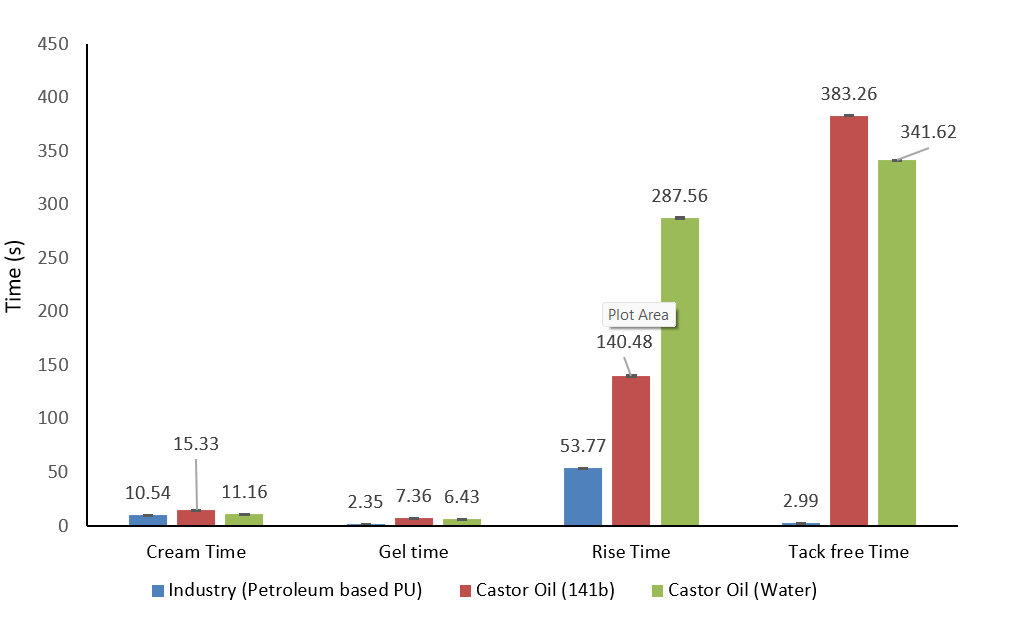 The graph in Figure 4 shows the time taken of the foaming process took place to produce PI, PCH and PCW. It is essential to record the cream time, the gel time, the rise time, and the tack-free time.to ensure the consistency, quality, and optimal performance of the material in real-world applications [11].