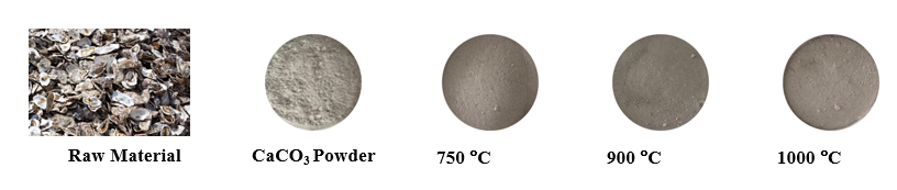 After being dried and ground into a 100-mesh flour, the color of the oyster shell powder changes to grayish white with a smooth texture. This color difference compared to other types of shellfish is caused by the mineral content and organic compounds contained in the shells before the calcination process [39].