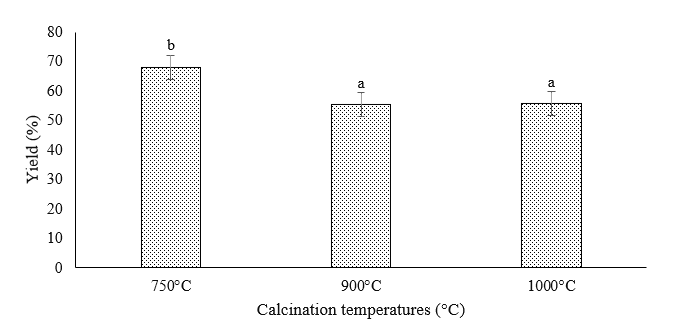 Figure 5 Yield of CaO obtained from oyster shell waste calcined at different temperatures (750, 900, and 1000 °C). Error bars indicate standard deviation (n = 3). Different superscript letters indicate statistically significant differences among the groups ( p < 0.05, Duncan’s test).